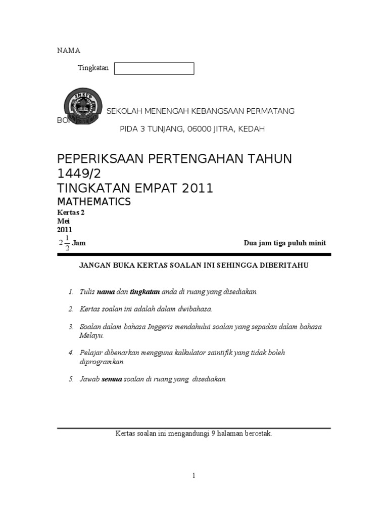 Peperiksaan Pertengahan Tahun Matematik Tingkatan 4 Kertas 2 Pdf